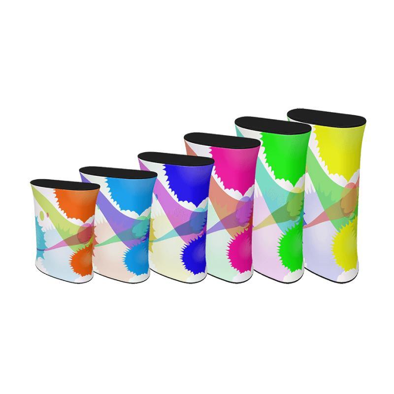 The portable 39″ Waveline Counter is a great stand-alone piece or can be combined with other displays. Perfect for trade shows and promotions. The Waveline counter is available in six different heights 34”, 39”, 44”, 49”, 54” , and 59”. The counter is easy to assemble and is made from durable aluminum tubing. The graphic attaches to the base and countertop via a silicone edging sewn into the fabric (SEG) with a zipper in the back for easy access to a small storage area. The counter has its own carrying case for easy transport.