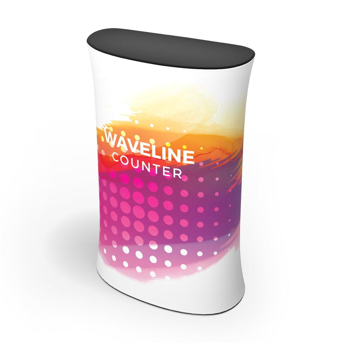 The portable 44″ Waveline Counter is a great stand-alone piece or can be combined with other displays. Perfect for trade shows and promotions. The Waveline counter is available in six different heights 34”, 39”, 44”, 49”, 54” , and 59”. The counter is easy to assemble and is made from durable aluminum tubing. The graphic attaches to the base and countertop via a silicone edging sewn into the fabric (SEG) with a zipper in the back for easy access to a small storage area. The counter has its own carrying case for easy transport.