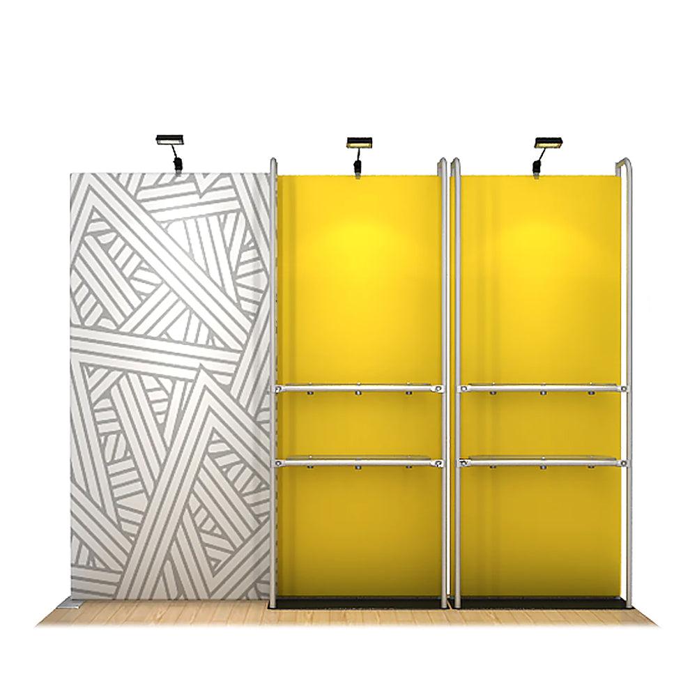 Our lightweight aluminum poles are designed with state-of-the-art modular construction so that you can tailor the display to fit your exhibit needs. Easily attach the included shelves and lights adding a touch of flair to your presentation. The included fabric slipcovers slide effortlessly over the frame and feature a hidden zipper at its base for seamless brand integration.